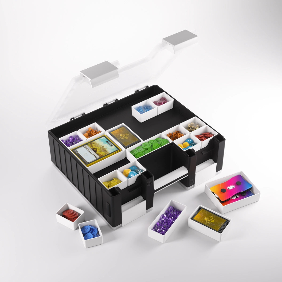 The Game Castle is a perfect storage solution for 6 Commander Decks** (6x 100 double-sleeved cards), tokens, dice, movement/range tools, and many other gaming accessories! One side of the box houses six removable card holders for 600 double-sleeved cards in Thick Inner Sleeves or 800 board-game-sleeved cards. The other side holds 19 removable trays in 5 different sizes, including an extra-long tray to store movement/range tools, two trays in Mini-American card size, and two in Standard Card Game size. The trays can be swapped with those from the Gamegenic Token Silo and the Token Silo Cards Add-on, offering many different size and color combinations. The innovative clip mechanism ensures precise and secure closure.